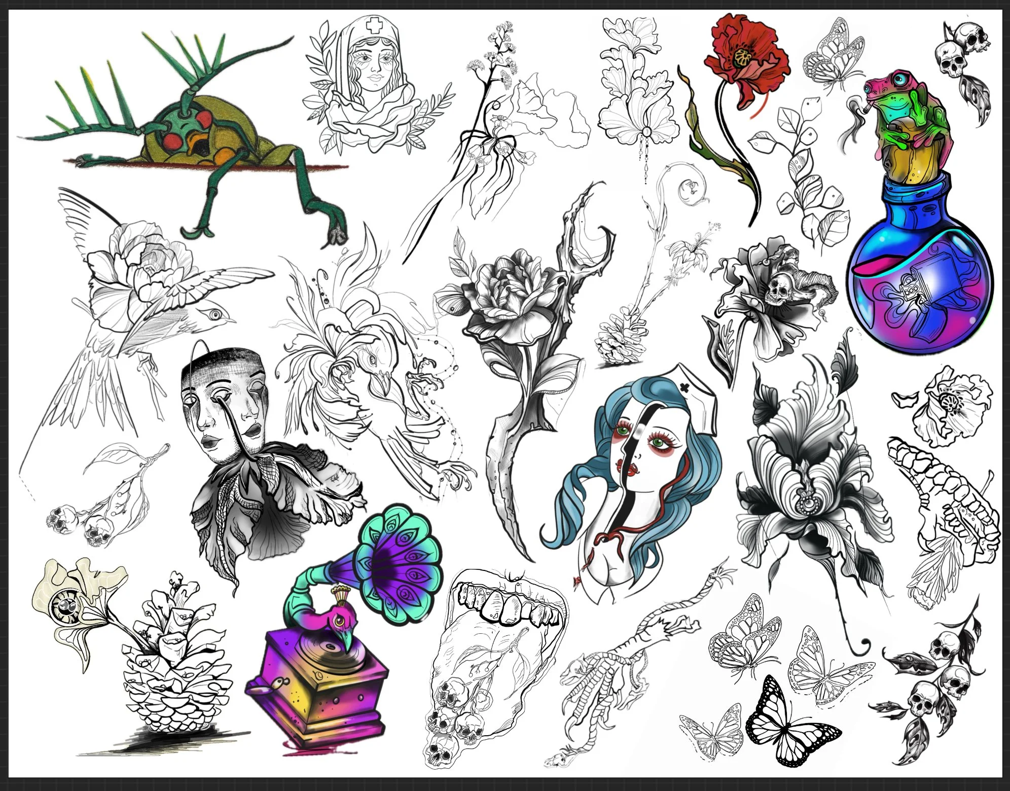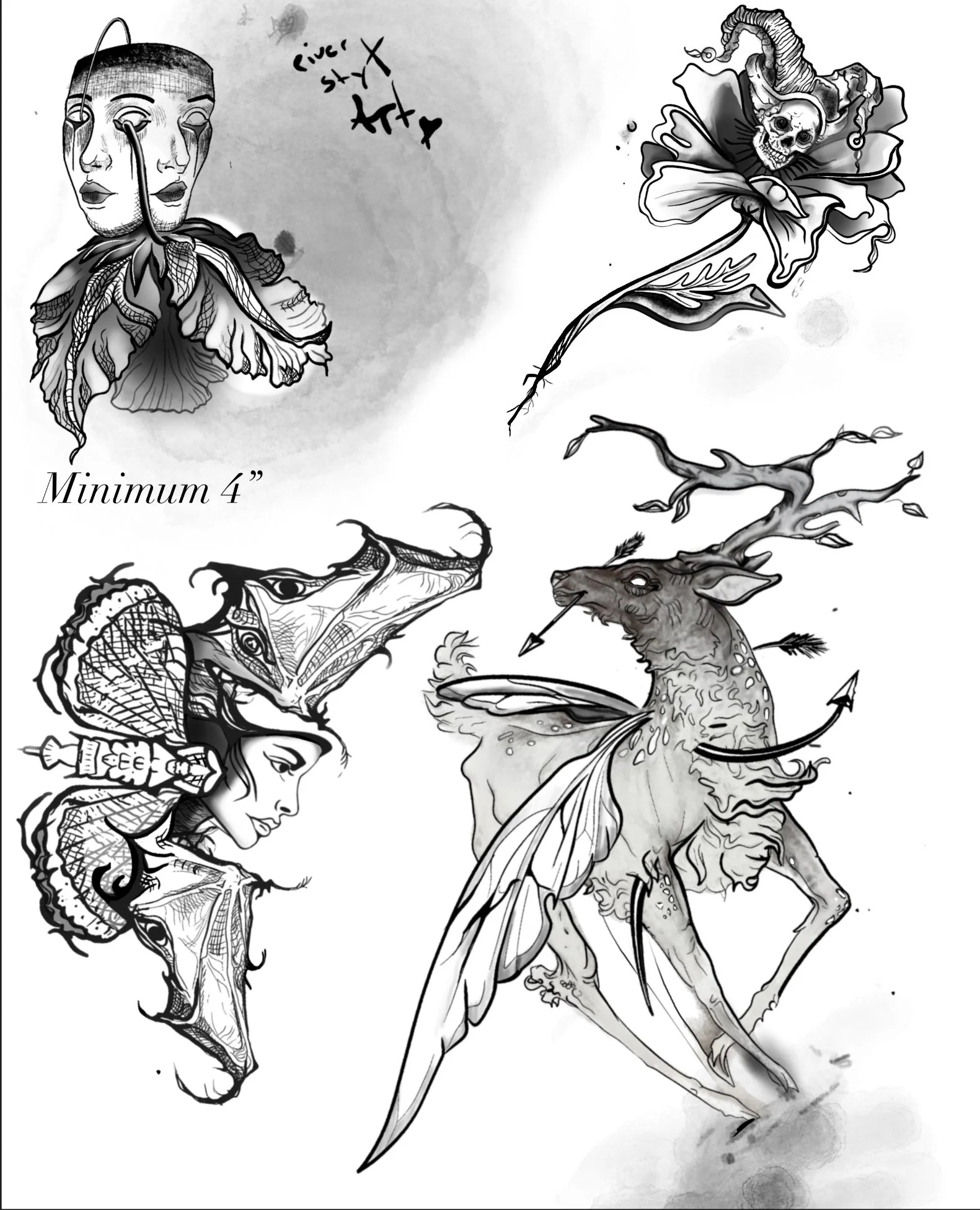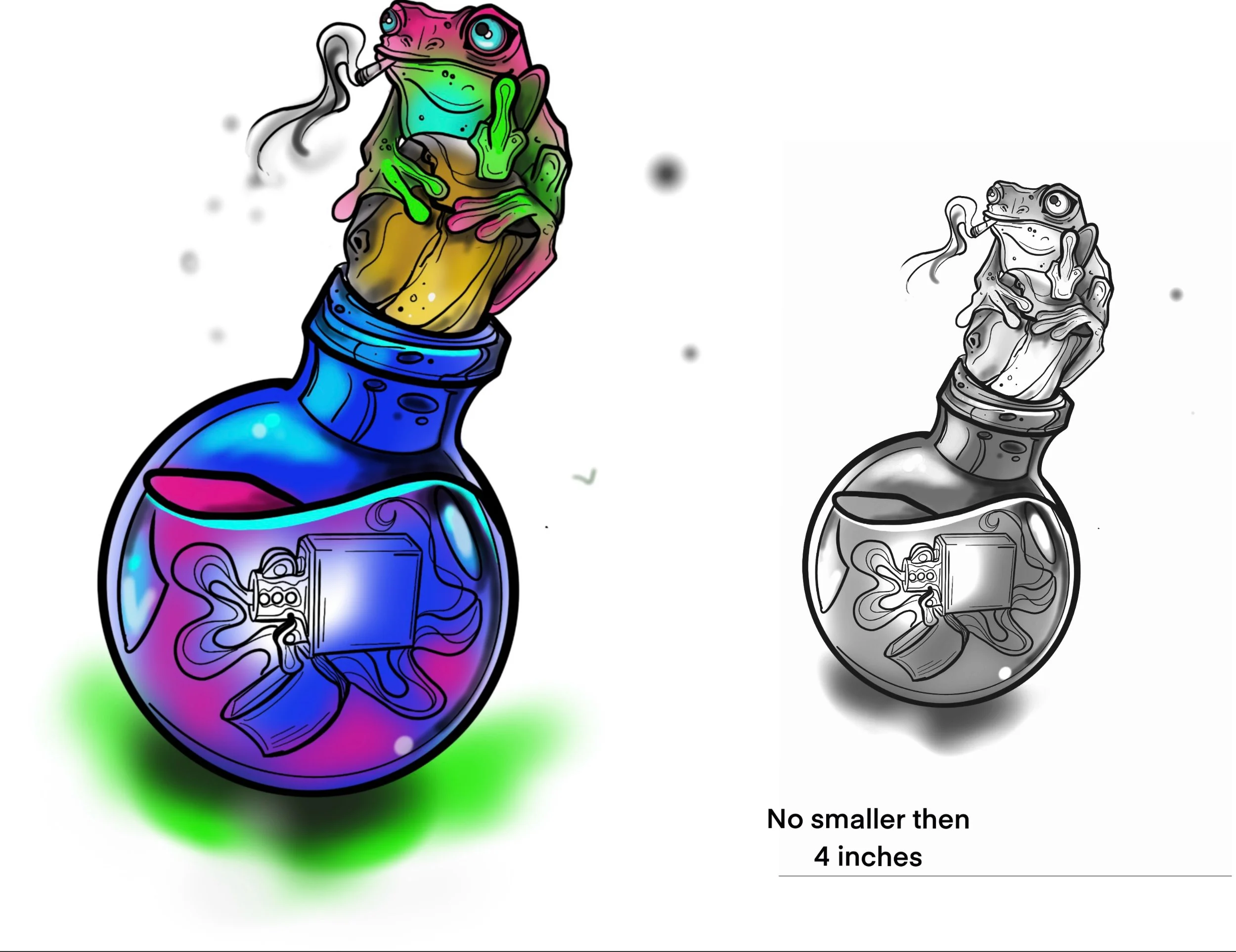 Let’s Create Art Please, No smaller than 2 inches. Keep in mind the smaller the tattoo the less details. Flash comes in Grey scale or Colour, however you like. :)